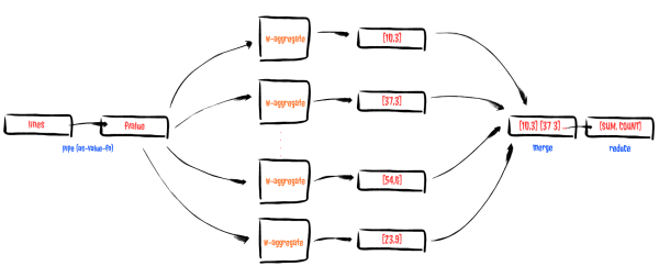 - Finally, we pass in each of the tap channel to the aggregate-field & count-lines functions and wait for them all to finish by a blocking (<!! operator) merge/reduce.
